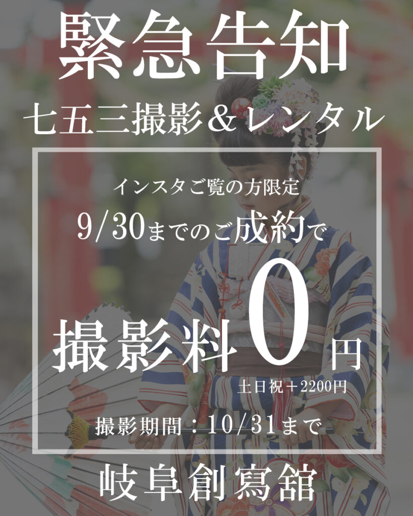おかげさまで七五三9月撮影のキャンペーンが大好評のためほぼ満員になりましたので、今月までの成約で