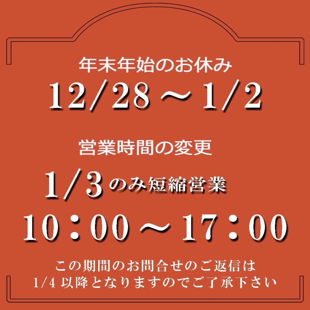 12/28〜1/2までお休みをいただきます。 1/3から10:00〜17:00の時間短縮での営業をいたします!