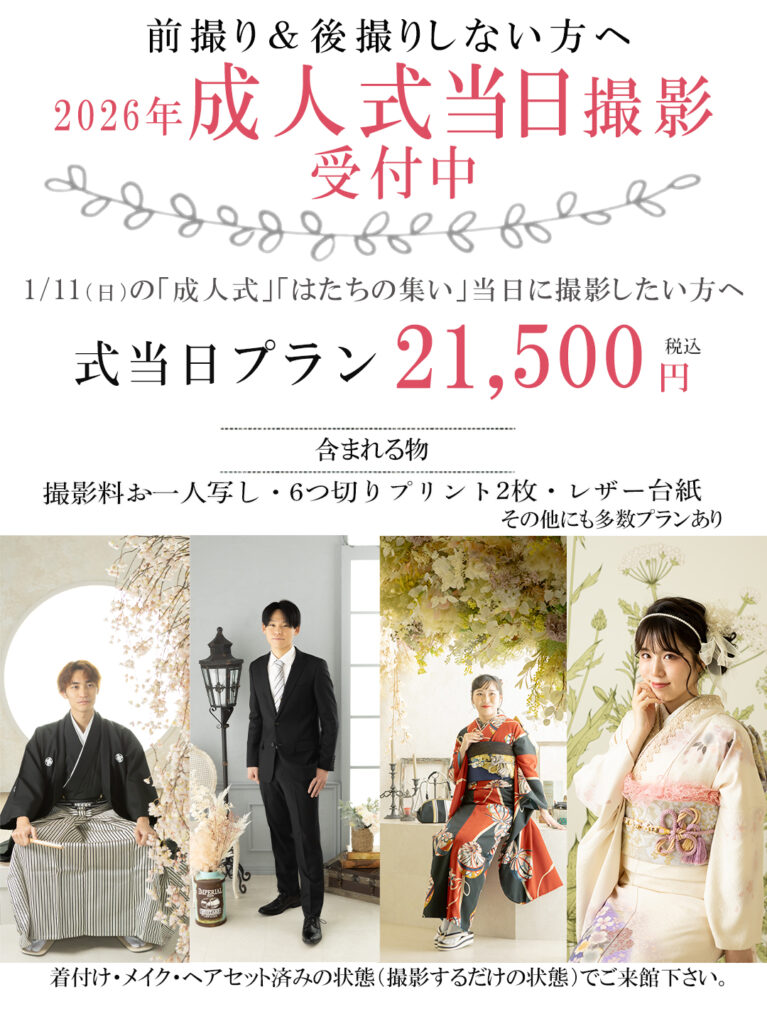 ❇︎2026年に成人式を迎える方へ!! 成人式当日の記念フォト 好評予約受付中! 「式の前に撮影したい」 「式が終わった後に撮影したい」 「忙しく後撮りもできない」 そんな方大歓迎! お支度済の状態でご来店 […]